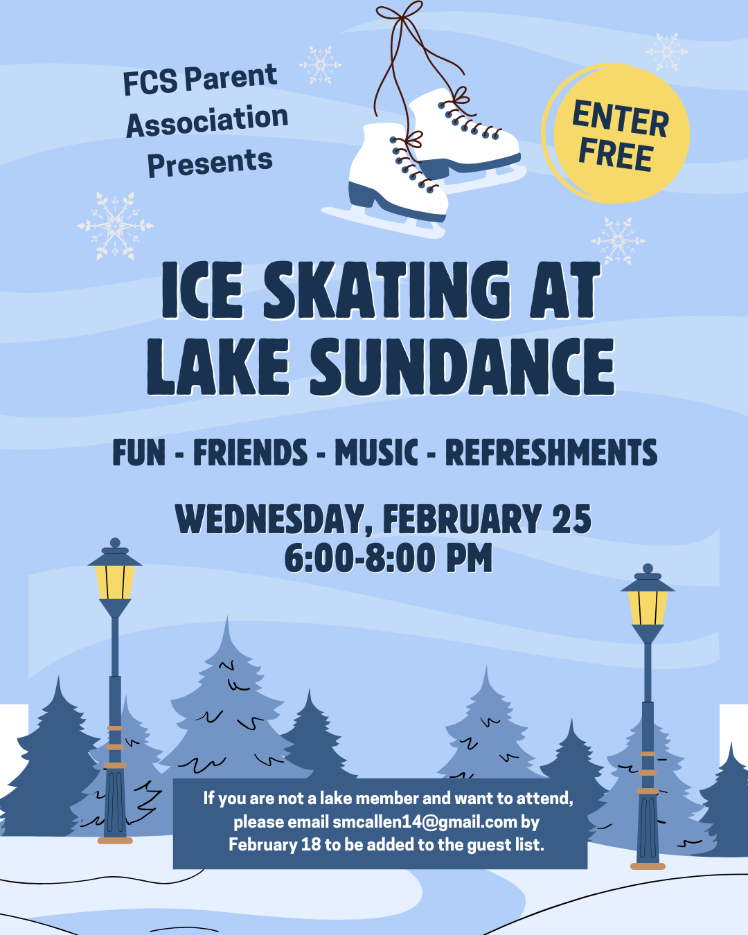 Join us for an enchanting night of skating under the stars! It's a free event and refreshments will be provided. We will be at Lake Sundance in the top rink on Wednesday, February 25 from 6:00 to 8:00 p.m. If you are not a lake member, please email smcallen14@gmail.com by February 18 to be added to the guest list.
